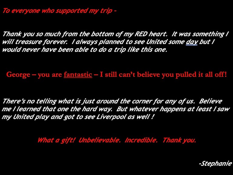 Keeping Steph’s spirit alive through unforgettable football journeys to Liverpool. Thank you for being part of this journey. Thank you for helping us honor Steph.